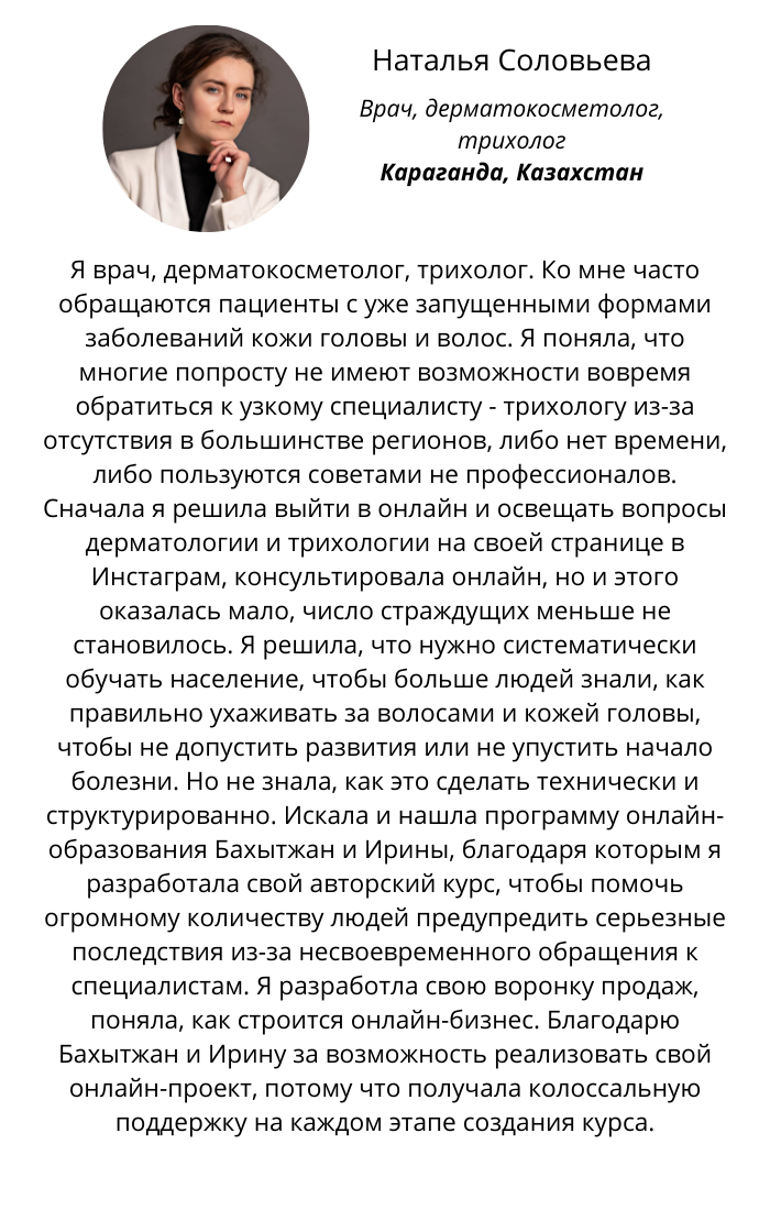 С конца 2023 года помогаю экспертам выйти в онлайн, монетизировать свои знания и навыки, создавать собственные онлайн-школы