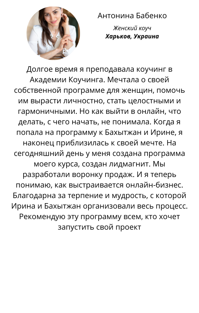 Я хотела развиваться, как коуч, даже была своя авторская трансформационная программа "Я - автор своей жизни", после которой женщины открывали свои бизнесы, но далее я не знала, как продвигаться в онлайн. Не было инструментов, поэтому пошла обучаться инструментам маркетинга и автоворонкам, была в наставничестве у Тимура Тажетдинова по вебинарным воронкам, обучалась у Рассела Брансона по воронкам.